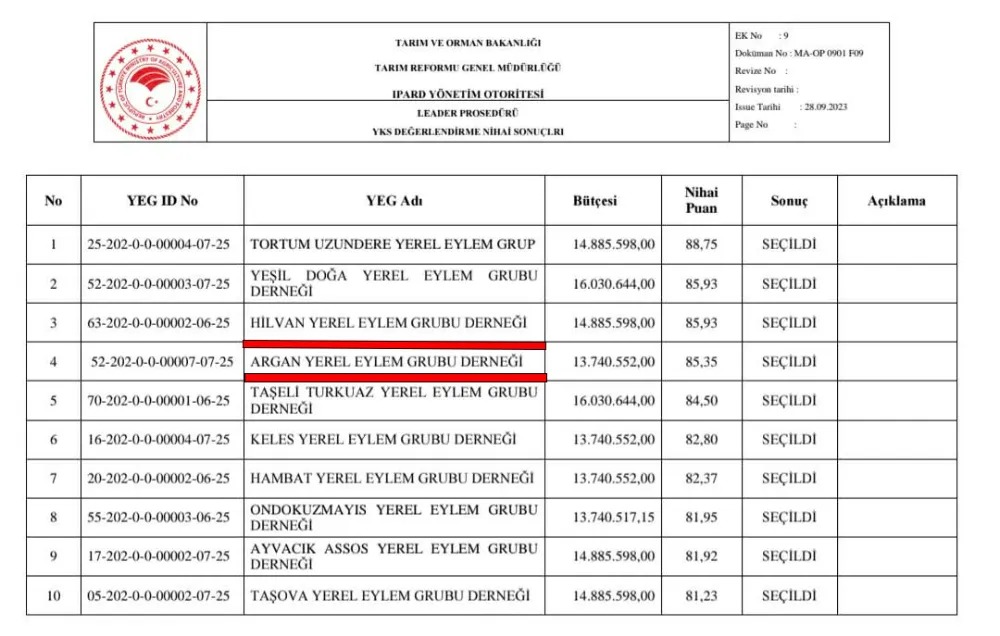 "Argan Yerel Eylem Grubu Derneği olarak IPARD II LEADER yaklaşımı kapsamında hayata geçirdiğimiz projelerimiz ve IPARD III LEADER Programı çerçevesinde özveriyle hazırladığımız 2025-2030 Yerel Kalkınma Stratejimizin yüksek oranda başarılı bulunması sonucunda, Türkiye genelinde müracaat eden 156 YEG içerisinde 4'üncü YEG seçilmiş bulunmaktayız."