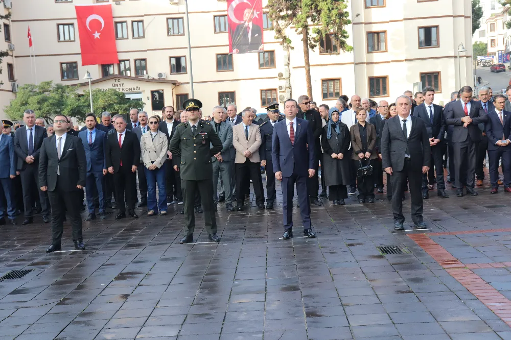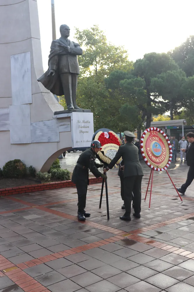 Ünye Cumhuriyet Meydanı'nda düzenlenen törende Kaymakamlık, Garnizon Komutanlığı, Belediye Başkanlığı, Ordu Üniversitesi Ünye İİBF Dekanlığı, AK Parti Ünye ilçe Başkanlığı, CHP Ünye ilçe Başkanlığı, MHP Ünye ilçe Başkanlığı, Anahtar Parti Ünye ilçe Başkanlığı, DİSK Dev Eemkli-Sen Ünye Şubesi, Türkiye Yardım Sevenler Derneği Ünye Şubesi ile Ünye Kent Konseyi çelenklerinin Atatürk Anıtına sunumu gerçekleştirildi.