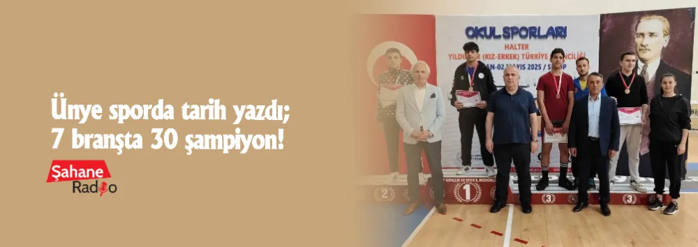 Ünye İlçe Gençlik Hizmetleri ve Spor İlçe Müdürlüğü, bünyesindeki antrenörlerin özverili çalışmalarıyla büyük bir başarıya imza attı. İlçe müdürlüğü tarafından yetiştirilen 7 branşta toplam 30 sporcu, ulusal ve uluslararası şampiyonalarda derece elde ederek Ünye’nin spordaki yükselişini gözler önüne serdi.