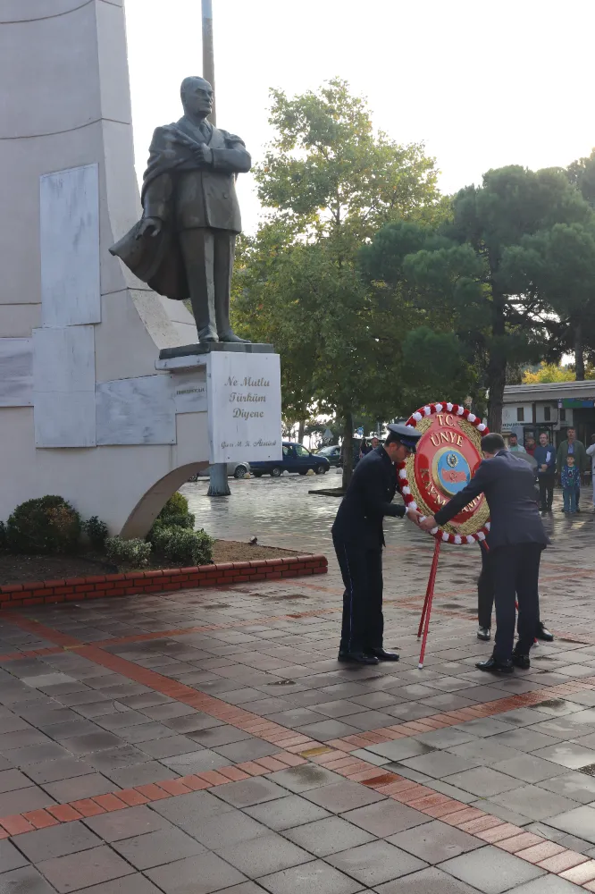 Ünye Cumhuriyet Meydanı'nda düzenlenen törende Kaymakamlık, Garnizon Komutanlığı, Belediye Başkanlığı, Ordu Üniversitesi Ünye İİBF Dekanlığı, AK Parti Ünye ilçe Başkanlığı, CHP Ünye ilçe Başkanlığı, MHP Ünye ilçe Başkanlığı, Anahtar Parti Ünye ilçe Başkanlığı, DİSK Dev Eemkli-Sen Ünye Şubesi, Türkiye Yardım Sevenler Derneği Ünye Şubesi ile Ünye Kent Konseyi çelenklerinin Atatürk Anıtına sunumu gerçekleştirildi.